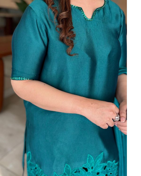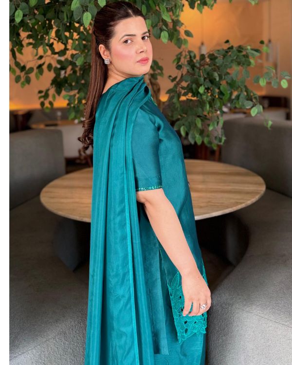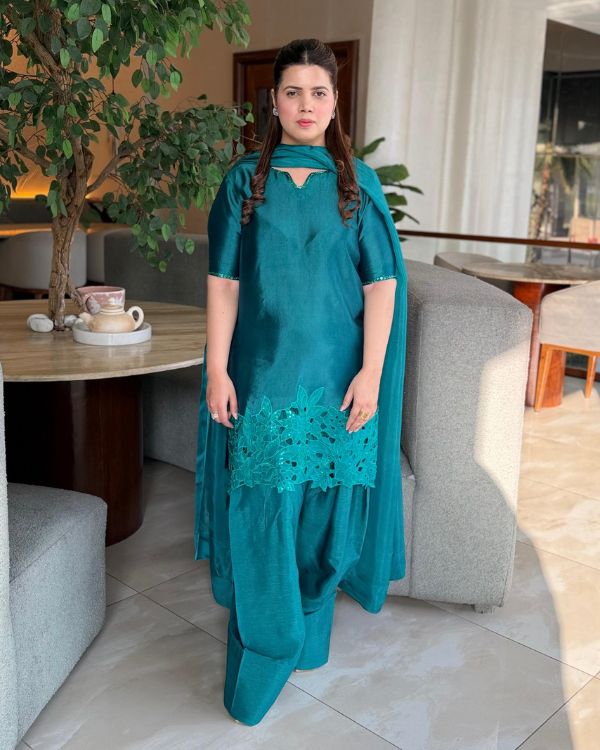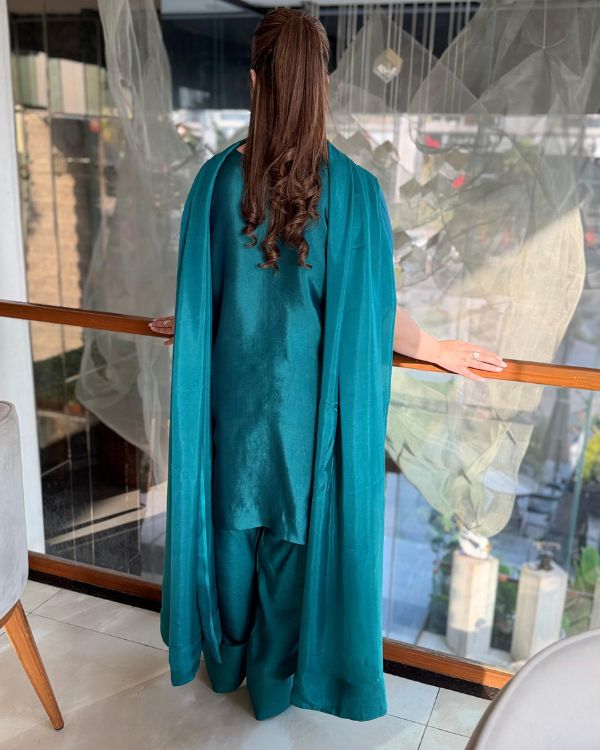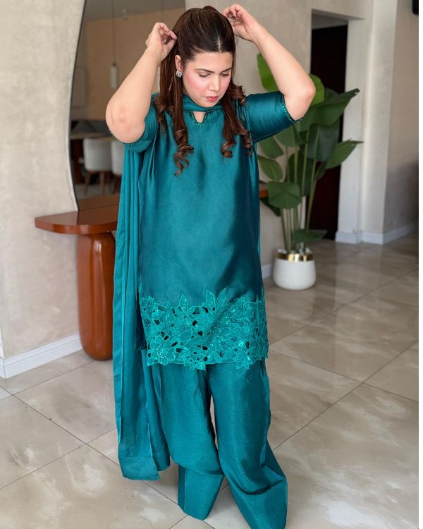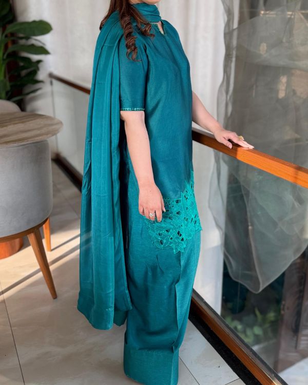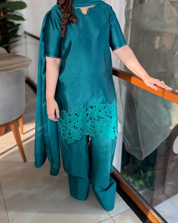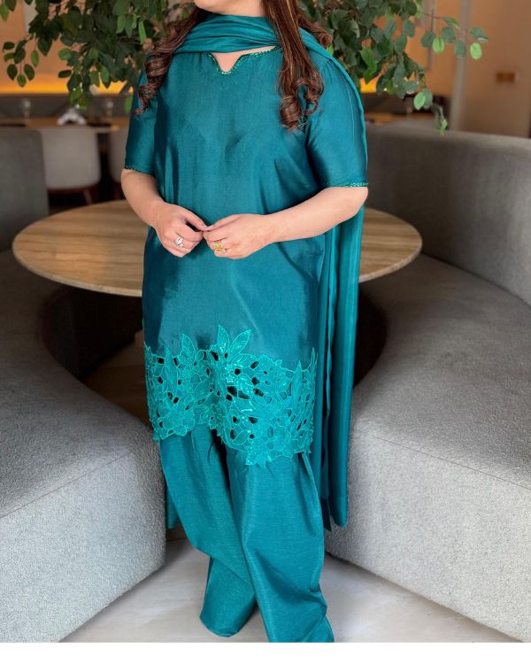 This elegant green ensemble showcases a beautifully tailored short shirt paired with a traditional Farshi shalwar, creating a graceful and sophisticated look. Made from smooth medium silk fabric, the outfit is complemented by a luxurious 3-yard dupatta that flows effortlessly. The neckline and sleeves are highlighted with exquisite hand embellishments, while the daman features delicate cutwork embroidery and detailed embellishment for added richness. The dupatta is finished with broad facing on the borders, enhancing the overall elegance of this timeless festive outfit this ensemble is perfect for festive occasions and formal. celebrations.