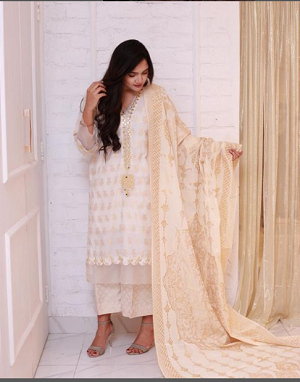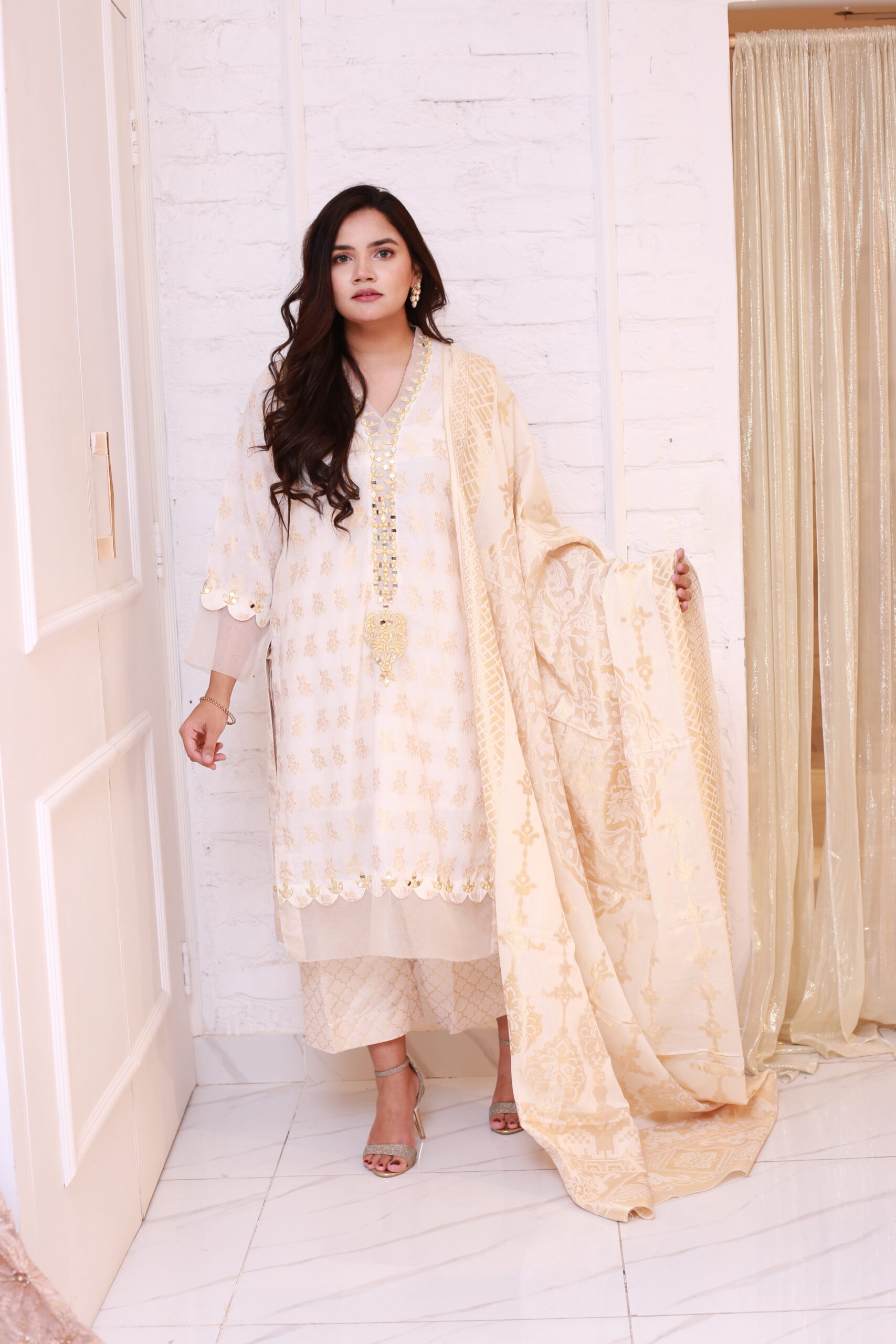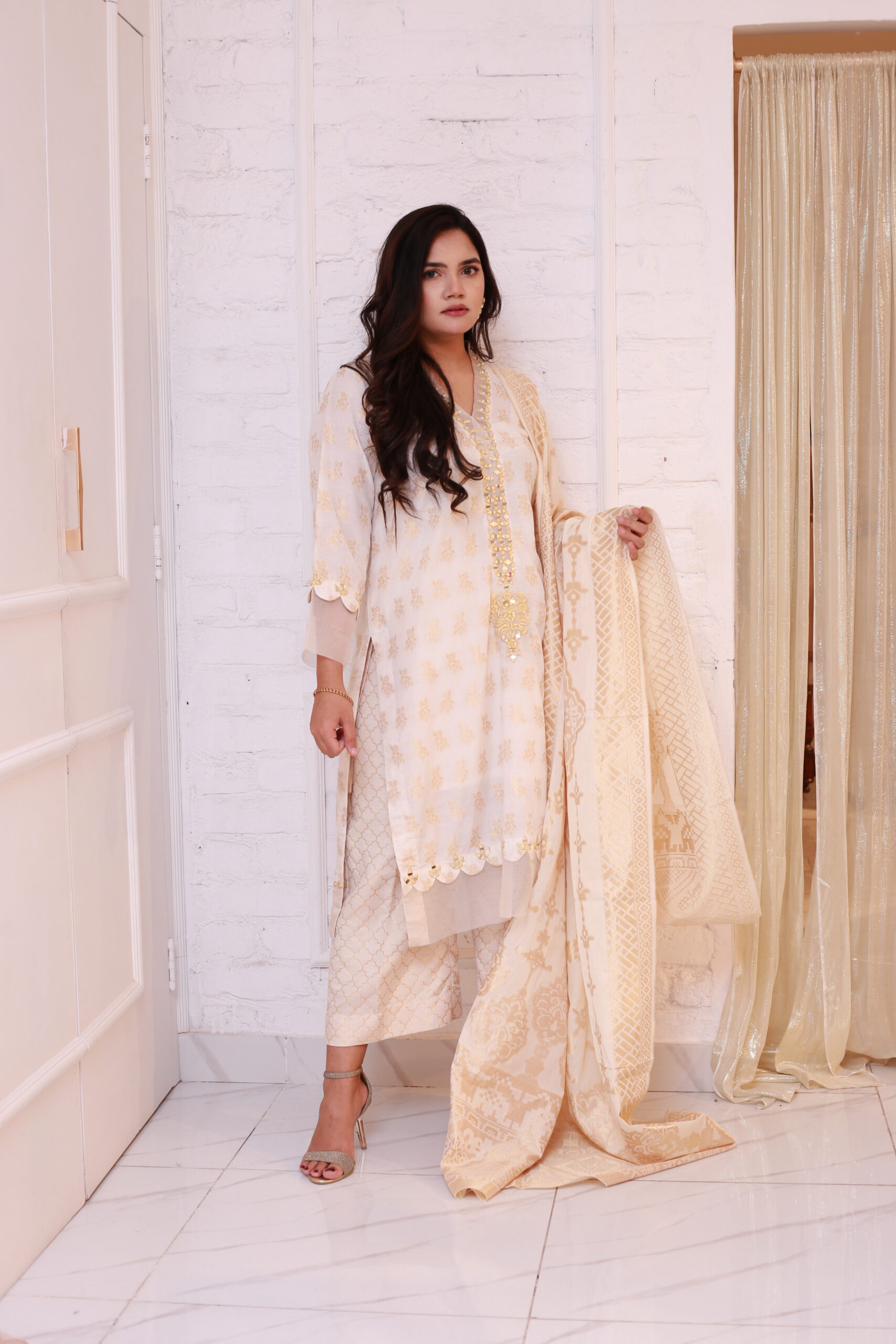 our off-white jacquard attire, adorned with intricate embroidery and dazzling mirror work. The perfect blend of tradition and style, this ensemble features a stunning palazzo and a jacquard dupatta, elegantly finished with organza. Celebrate every occasion in grace and beauty!”