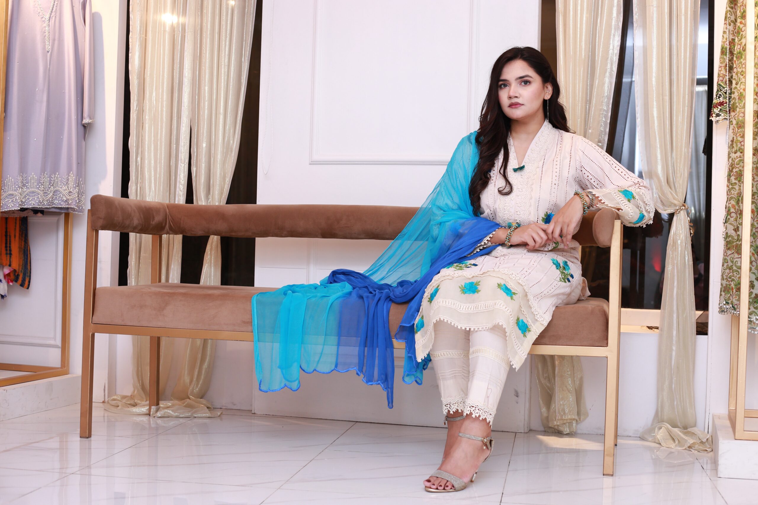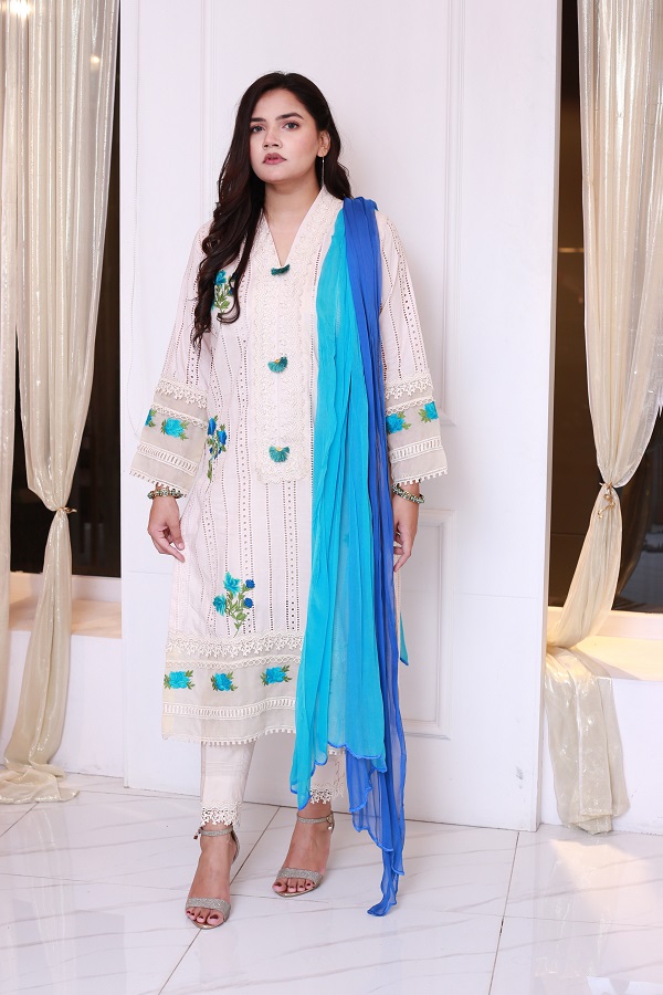 Step into sophistication with our beige outfit, adorned with stripes of chicken kaari and embellished with beautiful floral embroidered bunches. Delicate laces and charming buttons complete the look, while a soft organza finish adds a touch of ethereal grace. Perfect for any occasion, this outfit is a blend of tradition and style.