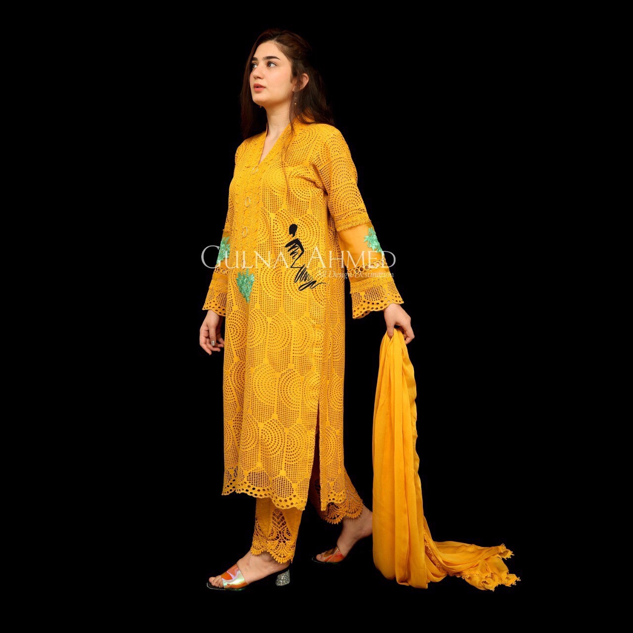 The intricate sea green embroidery motifs are a highlight of this design. Skillfully crafted, these motifs feature floral and geometric patterns that enhance the attire’s elegance. The contrasting sea green against the mustard creates a visually stunning effect, capturing attention and admiration from every angle.