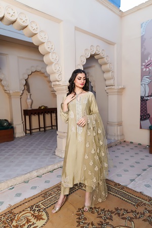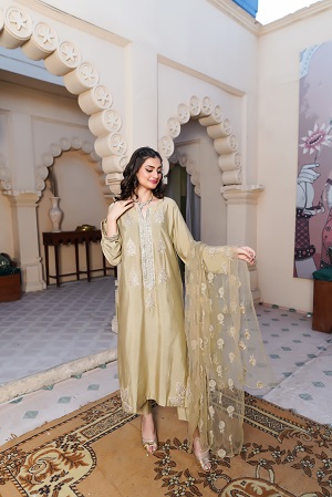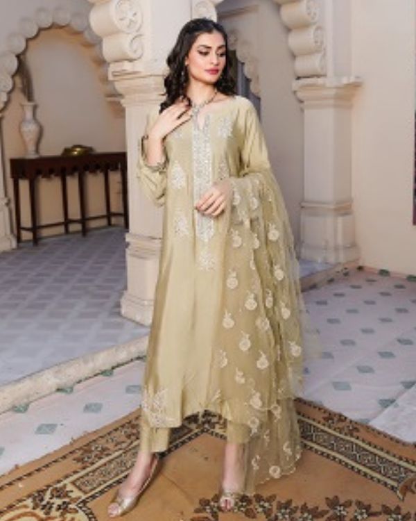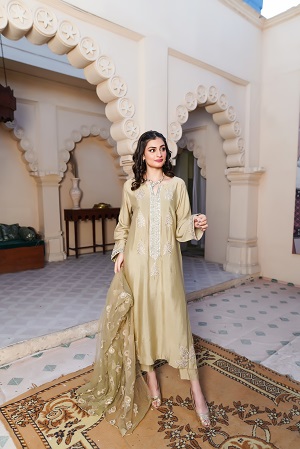 HAZEL “Radiating Elegance in Shades of Sand Beige. semi-formal attire whispers elegance and grace. creating an ensemble that exudes sophistication and timeless charm. dress with a tailored silhouette serves as the centerpiece, its delicate fabric shimmering under the light while exuding an air of refined sophistication. The bodice is intricately designed with delicate embroidery and embellishment that catch the eye, and the straight pants designed with pleats, A soft, earthy gold dupatta adorned with soft net embellishment and embroidery motifs slight flare that adds movement.