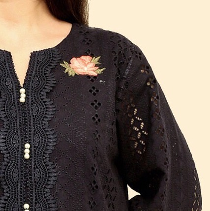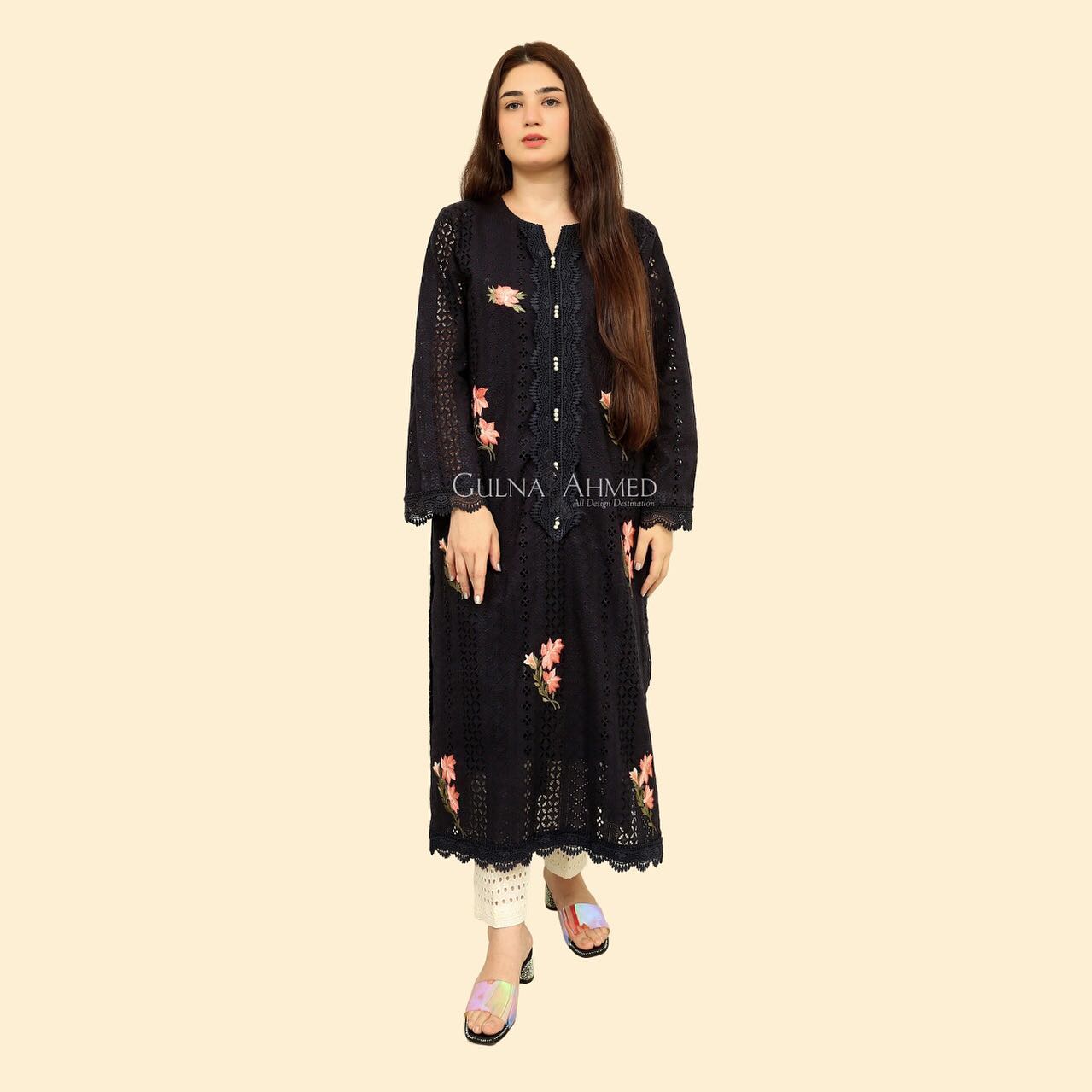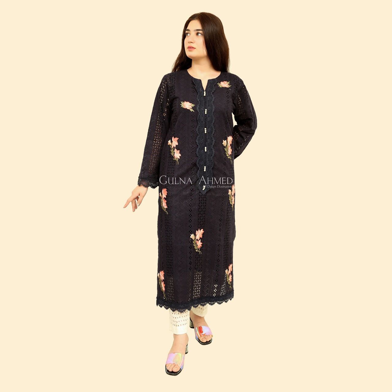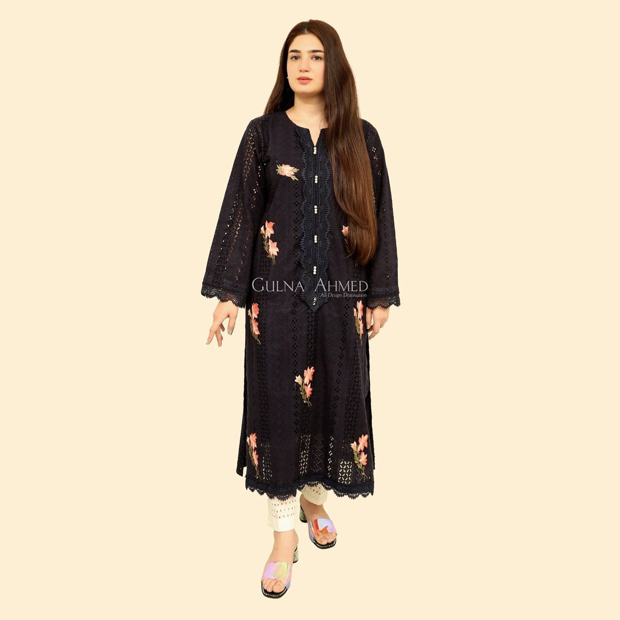 SAHAR [shirt] Step into elegance with our navy blue chicken attire, expertly crafted to capture attention. This exquisite piece showcases beautiful floral pastel embroidery bunches, bringing a touch of vibrancy to the rich navy fabric Enhanced with intricate lace details and delicate pearl work, this attire radiates sophistication and charm.